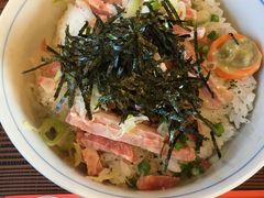 暖かいご飯と冷たいお肉。口の中で溶ろける感じ。