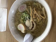 予備知識なくタクシーの運転手さんに連れて行ってもらった。高台の上にある見晴らし抜群の店舗。夏休み時期ながら14:00過ぎでサッと入れたが、テーブル席は満卓。風情あるカウンター。二人で帆立ラーメン醤油と塩。生ビールと熱々のラーメン。いやーー旨かった〜。
