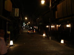 祇園では白川通りと並び、祇園を象徴する石畳が印象的な町家が続くとおりで、料理屋も多いが、実は看板をあげない一見お断りの店も多い、京都らしい街。