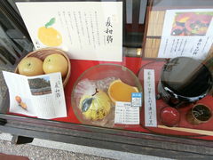 妻は言う「ここで食べたいんだよね」というので入った。ここは創業は明治41(1908)年の老舗和菓子屋。代表銘菓「夏柑糖@1296円/2個」は毎年4月1日より製造開始で、ゼリーではなく寒天を使用している。素材は「甘夏」ではなく、純粋種の「夏みかん」を用いているので、酸味が特徴的で、後味にも、苦みやえぐみといった素材が持つ本来の味わいなので人によっては、口に合わないかも。
