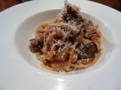 京都市役所の寺町通りを上がり、押小路通りを西に行ったビルの地下にあるイタリアンだ。店は広くなく、席の後ろに肉のストックスペースやワインセラーを設けるなどスペースを有効利用した内装だ。カウンターで10席ちょっとある。マスターが一人で切り盛りする店で、パスタ、肉料理、前菜などがメニューに並ぶ。料理には<京都>の名を冠したものが多く、地元産にこだわりも。ワインと料理を楽しむため、ビールは一種類しか置いていないという。この日は「京都ポークの白レバーの肉100%%c舎風パテ」や「京都ポーク塩煮ばら肉のソテー」「合鴨と新ゴボウの煮込みソースのペンネ」「自家製ハム類の盛り合わせ」などをオーダーした。牛肉だけでなく、ポークや鶏肉など幅広く提供する。マスターは一見職人風。メニューには食べる量のおおむねの目安が書いてあり、一人なのでできるだけまとめて注文してほしいと但し書き。が、接遇は見事だ。数組の客を一度に引き受けても順々にタイミングよく料理を提供。その合間に食器を洗い、カウンターを出て熟成肉を見つくろい、ワインを選び、勘定をこなす。さっきまでカウンターで会話をしていたと思えば、次の瞬間には背後のストックルームで肉を見ている。まるで千手観音だ。