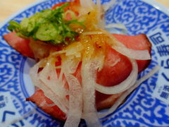 マグロにイカにエビにとたくさん食べてましたが、かつおのたたきにゆず塩が効いたさっぱりとした味が特に食感もコリコリしていて美味しかったです。