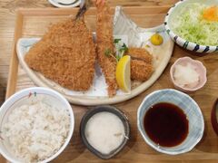 季節のおすすめメニュー、大判あじ・海老・ヒレかつ定食をいただきました。謳い文句通り大判なあじフライで満腹なお品でした。