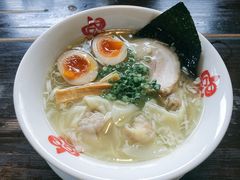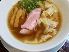 醤油ラーメン、透き通ったスープは魚介系でしょうか、あっさりお味、細ストレートやや固めツルシコ麺によく合います。メンマ、チャーシューも美味しい。見た目もきれいでバランスよいラーメンでした。人気は海老ワンタン醤油ラーメン。人気店につき、昼時はお待ちは必須ですが、回転は早い。駐車場も広い。