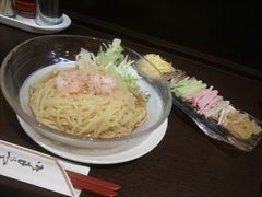 三月の訪問でしたが冷やし中華発祥の店はもちろん年中無休で冷やし中華を提供していらっしゃいました。祝日でしたが店内は八割ほどの混み具合で、皆さん特に冷やし中華にこだわらずランチを召し上がっている様子。地元の方にも愛されるお店なのでしょうか。注文した冷やし中華は麺と具が別盛で提供され、きれいに並んだエビや卵の色合いが涼しげです。まぁ結局全部混ぜてしまうので初めから麺に乗せて頂いて構わないのですが。。味はすっきりした酢醤油ベースで王道の冷やし中華でした。次回は暑い時期にお邪魔したいです。