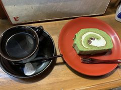 自家焙煎ドリップ珈琲と抹茶のロールケーキをチョイスです。