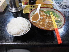 味噌汁は、葉野菜やモヤシの他、豆腐、豚肉、玉子など具沢山で、もちろんごはんも付く。テーブルに油みそが置いてあって、食べ放題。深夜までやっているが、夜遅くなると値段が上がる。