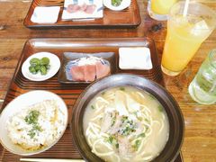 石垣島の中心、メインストリートに立つホテルククルの1Fにある八重山料理のお店です。夏休み中で観光客、特に外国人のお客さんが多くとてもにぎわっていました。「八重山そば・じゅーしーセット」を注文、すぐに出てきました。八重山そばはバラ肉、さつま揚げ、青ネギがのったシンプルな具で、出汁が効いていて美味しかったです。じゅーしーはもちもちでとても美味しかった!赤身の刺身と漬物がついて880円はコスパが良いと思います。HPのクーポンを見せるとドリンク1杯無料で、マンゴージュースやパッションフルーツジュース(430円)が飲めるのでお得です!