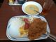 大きめのとんかつに、ハンバーグ、厚切りハム、玉子焼きなどがたっぷりという感じで、これにご飯とコーンスープでいただく。確かに、食べ応えがあって、大満足であった。