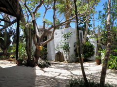 来間島にあるカフェで、ちょっとしたジャングルの中にいるような心地よい空間です。白いサラサラの砂が敷き詰められていて、裸足で食事ができます。