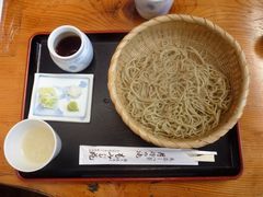 水車で石挽されたそばは香り高くつゆなしでまず頂きたい。また新緑やもみじの中に滝が見える名所でロケーションもバッチリ。