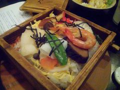 友人の案内で尋ねた。予約してあり、八寸から始まったコースでおなかいっぱいだ。友人が気を使って注文してくれたのが、ばら寿司とぬく寿司。前者は言ってみればちらしずしだが、素人目にもわかる違いは具材の数だ。丁寧な説明書きをいただいたが、不用意にも紛失してしまった。海の幸、山の幸合わせて確か36種類ではなかったか。友人によると、まずは具材をつまみにして一杯やりながら、頃合いを見て皿に盛って食する。一方、ぬく寿司はせいろにいれて温めたばら寿司(?)だ。「ぬく」は「温」の意であろう。店内は明るく、清潔だ。いっぺんにファンになってしまった。