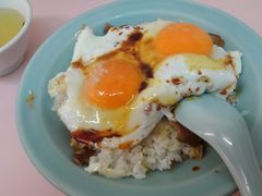 目玉焼き2つの普通盛りを注文し、目玉焼きをレンゲで割り、チャーシューとご飯になじませて食べる、その食感と味が何とも言えないおいしさです。