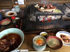 地鶏の炭火焼きをいただけるお店で噛みごたえのある地鶏が美味しくて癖になります。自分達で炭火で焼きながら食べるので夏場だとちと暑いけどやっぱり美味しい。いつも夫婦で定食を注文します。地鶏炭火焼定食には地鶏肉に焼き野菜、ごはん、味噌汁、地鶏の玉子がついてます。お肉はタレを絡めた状態で出てくるので後半になると味が染みた地鶏と玉子かけごはんを一緒に食べるのも美味しくて好きです♪