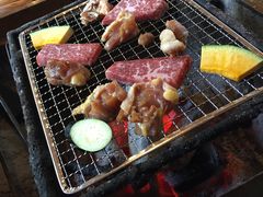 自家牧場で育てた阿蘇和牛と地鶏を炭火焼きで堪能できます。