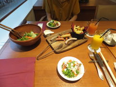 店長おすすめの2品:サラダとソーセージ・ポテトの盛り合わせ