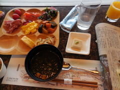 ホテルニューオウミに宿泊した翌日に朝食をいただきました。赤こんにゃく、近江の豚の和え物、近江米など近江色あふれる朝食に満足しました。