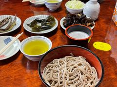 順番が来て食べたら、太麺のお蕎麦に辛い大根汁のつゆで美味しかった。又、わらび・山菜・ぜんまいの3種類の付け合わせも新鮮で柔らかく、とても美味しかった。3杯お替わりして満足でしたが、通常男性は3倍が平均だとお店の方が言っていましたが、麺が太いので1杯も結構なボリュームだと思うけど、それでも食べてしまうのは麺が美味しいからだと思います。