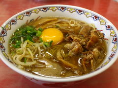 これはすき焼き?みたいな風貌で、ちょっと引いたのですが、せっかく徳島まで来たのだからと、いただいてみました。驚きの美味しさです。確かにラーメンなのです。ラーメンの上に、チャーシューというより、味をつけて煮込んだ薄切りの豚肉なのです。すき焼きのように甘くはないのですが、味は濃く、ラーメンのタレで煮たのかな?というお味です。少し味が濃いので、生卵であえるとまろやかでコクが出てまた、美味しいのです。また食べたいです。 詳細情報をみる - 行った時期:2017年8月