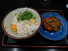 一番人気の釜玉うどん(小240円)とかき揚げ(90円)