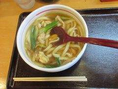 一番人気の白ネギ入り「味鶏(あじどり)うどん」、きくらげ・人参・にんにく・エビ・豚肉入りの「スタミナそば」、セルフのおでんなど、お昼にいただきました。