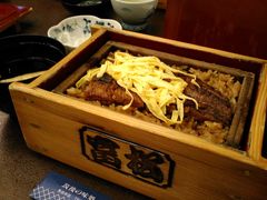 蒲焼にしたうなぎをせいろにいれた甘だれご飯のうえに敷いて蒸気でむします。あつあつのせいろむしたべるのが至極の楽しみ。