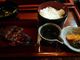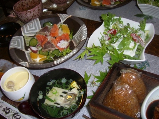 平日限定1200円の昼膳を食べました。シーフードカルパッチョ、野菜たっぷりサラダ、茶碗蒸し、お吸い物、ウナギのせいろ蒸しの大きなおむすび2個(パリパリの有明海苔付き)、セルフサービスのコーヒー付きです。器もお洒落でどれも美味しく、しかもボリューム満点!母も私もおむすび1個は食べきれずに持ち帰りました。