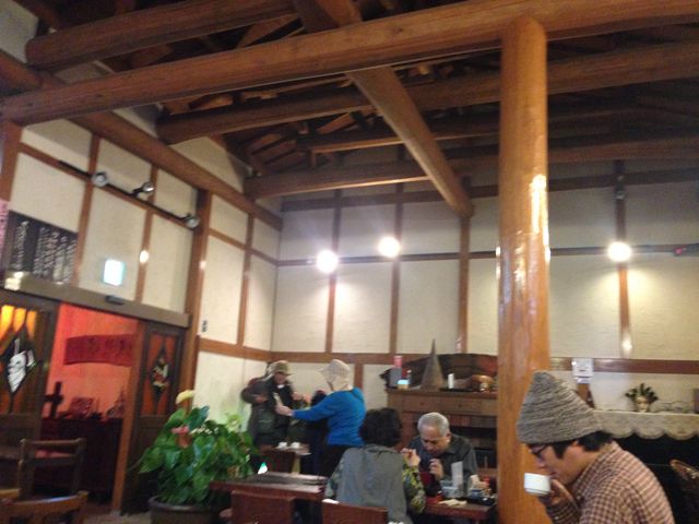 店の入り口は小さいけれど、奥に進むにつれて広く高くなり、大きな梁とステンドグラスの美しい、ジャズが流れるお洒落で落ち着いた雰囲気のお店です。