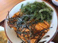 沖縄で海ぶどうを頂くのは5回目ですが、ここの海ぶどうが一番です。粒が柔らかく、軽く噛むと口の中で弾ける食感が良くボリュームもありますか。海ぶどうのほんのりした塩気、ウニ、甘めの醤油ダレのバランスが良くが、美味しかったです。
