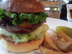 木を基調にした北米っぽいおしゃれな雰囲気のお店でした。私はアボカドチーズバーガーとチェリーコーラを注文したんですが、どちらもおいしかったです。あと大きいわりに食べやすかったです。犬(小型犬だけ?)と一緒に入れるのもよかったです。
