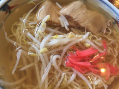 期間限定で『らーそば』といわれる、ラーメン(税込580円)がメニューにありました。面白い試み。早速頼んでみたところ、薄茶色く透き通ったスープに、チャーシュー、紅しょうが、もやしがトッピング。シンプルなラーメンです。