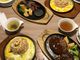 (上)カット・ステーキ150g とガーリック・ライス、(下)スライス・ステーキとハンバーグ。
