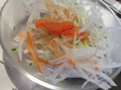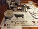 寛屋では、二つ割りされたハンバーグを鉄板で追加焼きする際に、店員さんが油を含んだタレを多めにかけるのが特徴です。それはもう、他の店とは比較にならないくらいに湯気が多く舞い上がり、油のハネが四方に飛び散ります。自分にかからないように、大きめのランチョンマットを手前に引いて油のハネを遮るのです。ハネが収まる頃には、テーブルの上やランチョンマットは油がべっとりです。店員さんの指示通りにランチョンマットで防護していないと、注意されます。何も、ここまで派手にやらなくてもと思わなくもないですが、これが寛屋の流儀のようです。野趣ある演出は、アジアンな店内の雰囲気と相まって、なかなか楽しめます。黒毛和牛100%のハンバーグは、もちろん美味しいです。
