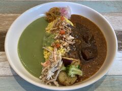 まず頂いた「狭山茶カレー」はグリーンのビジュアルが目に鮮やか。辛さは「中辛」の一択で、メニューには「湯飲み茶碗1杯分の狭山茶を使用」と記されています。口に運んでみると緑茶の風味は仄か且つ円やかな味わいで、クリーミーな口当たりがどこか抹茶ラテを想起させますね。それでいてスパイス感はしっかり伝わり、ライスや各具材との相性も良し。たいへん美味しいです。