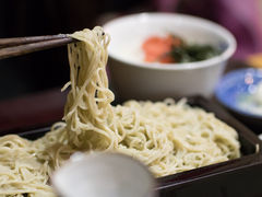 京浜東北線の浦和駅と埼京線の浦和駅の間、さいたま市役所の前にある蕎麦屋です。どちらからも1kmくらいあります。ここの特徴は、蕎麦が極細であることとてんぷらはないことです。つゆは少し濃さを抑えて極細の麺と馴染むようにしてあります。喉越しと香りが十分に楽しめるお蕎麦です。