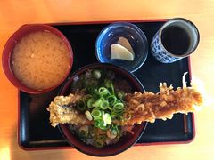 泉佐野漁港青空市場の2階にある店です。市場に魚介類を買いに来たついでに昼食をしようと寄りましたが、店の前には人だかり。昼の1時を過ぎていたのですが、待ち時間が30分以上。ここを目当てに来たのですが、仕方なく他の所へいきましたが、ここは、何度も来ているので、よければそのときの感想を書かせてもらいます。ここは、地元産の魚介類をはじめ、新鮮さでは間違いありません。特に大阪湾産アナゴの天ぷらや丼、また、煮アナゴが大きく食べ応えがあります。アナゴの他には、エビ天の海老が結構大きいです。