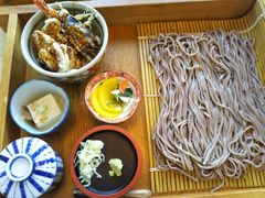 家族でドライブの折、昼食で訪問。天丼やソースかつ丼の小丼と盛そばのセットメニューを選択。ほどなく登場のセットは箱膳に収まって見た目も楽しませてくれます。そば、丼ともに美味しく、食べごたえもあり。うどんもコシあり、食感良好。セットには、茶わん蒸し、やっこ、漬物も付いて1000円でおつりがくる、CP良し。地元の方でしょうか次々にお客が来てました。