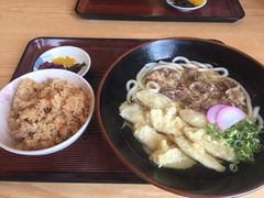 お昼時はけっこうお客さんが多いと聞いてランチで行ってみました。定食などのセットもありましたが、単品でかしわ飯と肉ごぼう天うどんを食べました。コシのあるさぬきうどんも好きですが柔らかなうどんも好きなので美味しかったです。