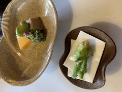たらの芽天ぷら、胡麻豆腐、卵焼き、菜の花の白和え