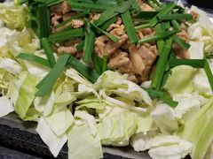 鉄板に、キャベツ、もやし、ニラ、ホルモンがのって出てきました。