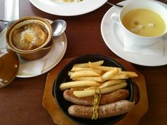 ソーセージ、オニオングラタンスープ、コーンスープ