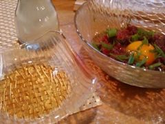 馬刺しユッケはオリーブオイルが一緒に出てきてつけて食べてみましょう。