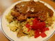 ドライカレーの上にカツを乗せて、さらにその上にカレーをかけるという、しつこいくらいカレーなメニューなんですが、このカレーが全然しつこくないんです。