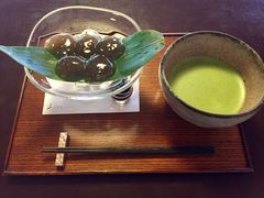 純和風の素敵な建物とお庭を眺めながら、本わらび粉で作られた、あんこ入りのプルプルわらび餅とお抹茶のセットを頂きました。