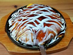 広島風お好み焼き(20センチ)。これも鉄製の器にネタを注いで焼かれています。とろみのあるお好み焼きソースの上に、格子状に振りかけられているのはマヨネーズなのですが、ケーキを飾るジャムやホイップクリームに見えます。まるでスイーツ扱いです。店の名前が「すいーとぴー」となっている理由かもしれません。味は、中にソース焼きそばが入っていた事を除けば、普通の広島焼きでした。