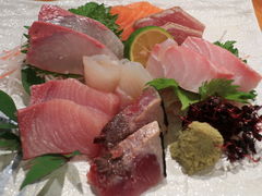 店舗の内装がカウンターバー風なので少しイメージが違うが、基本線は日本酒と魚介類の店だ。余りに気にいったので2018年12月と2019年2月の2回も通ってしまった。何よりの特徴は上質な刺身。本当においしいと思う。この日は盛り合わせでスタート。ウニ、カツオ、ブリ、ヒラメなど定番の魚ばかりだが、何しろ味がいい。太刀魚の塩焼き、セコガニの甲羅盛り、マナガツオのたたきなども魅せる。居酒屋の定番メニューも豊富で、イモのてんぷらを食べたがボリュームがあって少し困ったぐらいだ。