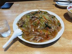 二人で「五目あんかけ焼きそば」と「トンテキ」を頼みました。焼きそばは、とんでもない量なので、取り皿をいただいて分け合って食べました。量だけじゃなく味もいい。