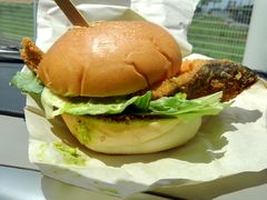 鮎解禁が日本一早いので有名な場所ですから鮎料理が美味しいですね。普段は宿泊利用でしたが今回は宿泊時に目にした一風変わったアユバーガーなるものをテイクアウトしました。鮎一匹を揚げたのが挟んであったので結構な値段しましたが美味しかったですね。鮎である必要はないかも知れませんが笑。
