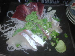 鰹のあぶり(バーナーであぶる)、刺身3種盛り(写真)、カンパチポン酢、青のりの天ぷら、チャンバラ貝、長太郎貝のソテー、鰹のたたき、小アジの天ぷらの8品でした。