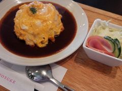 ワンコインで、デミソースのふわふわオムライスが美味しいです。駐車場もありました。コスパ良しのお店です。